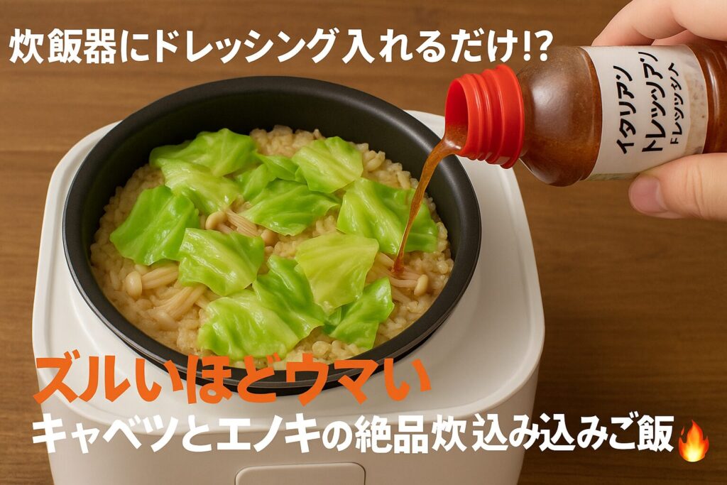 🍚✨【知らなきゃ損!】炊飯器にドレッシング入れるだけ!? ズルいほどウマい🔥キャベツとエノキの絶品炊き込みご飯レシピ大公開やで!