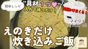 - お米とエノキをIN!洗ったお米の上に、ほぐして切ったエノキを乗せてな。