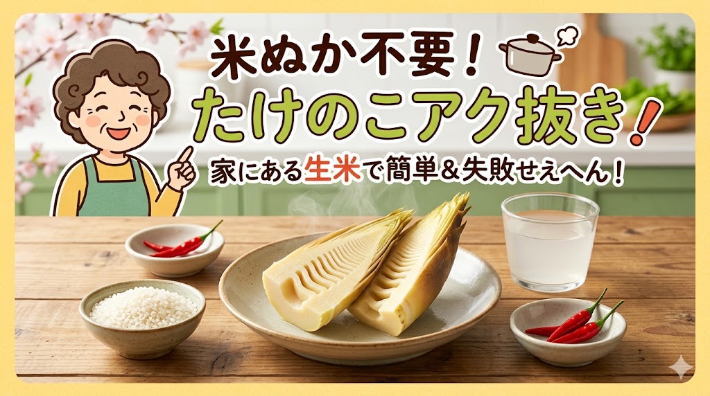先に結論言うとくで。米ぬかなんかなくても、家にある「生米」か「お米のとぎ汁」、なんなら「重曹」があればアク抜きは完璧にできるんや。
