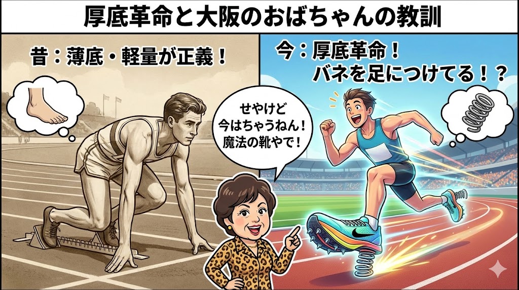 これ、笑い話やけど、これから運動始めようとしてる私ら世代には、ほんまに大事な教訓が詰まってるんよ。麻子さんの体験談をもとに、今流行りの**「厚底カーボンスパイク」の魔力と危険性**について、おばちゃんが愛を込めて解説するで!