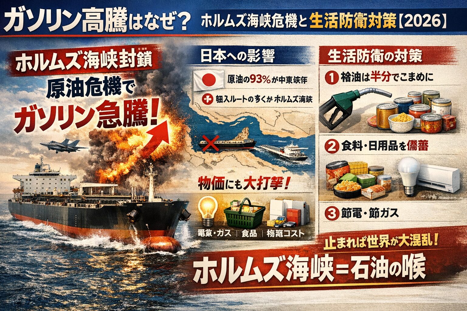2026年のホルムズ海峡情勢の緊張で、原油の供給が不安定になって、ガソリン・電気・食料まで値上がりの連鎖が起きる可能性がある。