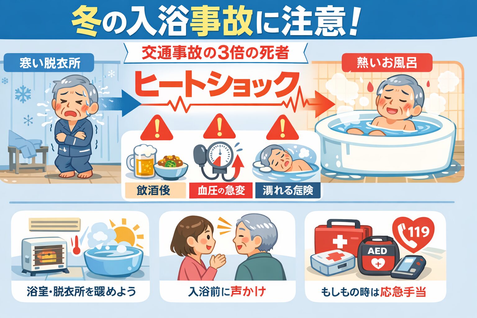 今日は、冬場に急増する**「入浴中の事故」**の話。