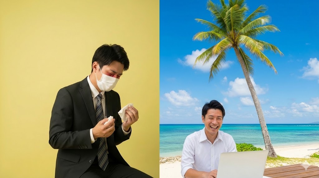 • 誰: 重度の花粉症に苦しむリモートワーカーやフリーランス、または有休をまとめて取ろうか迷っている会社員。