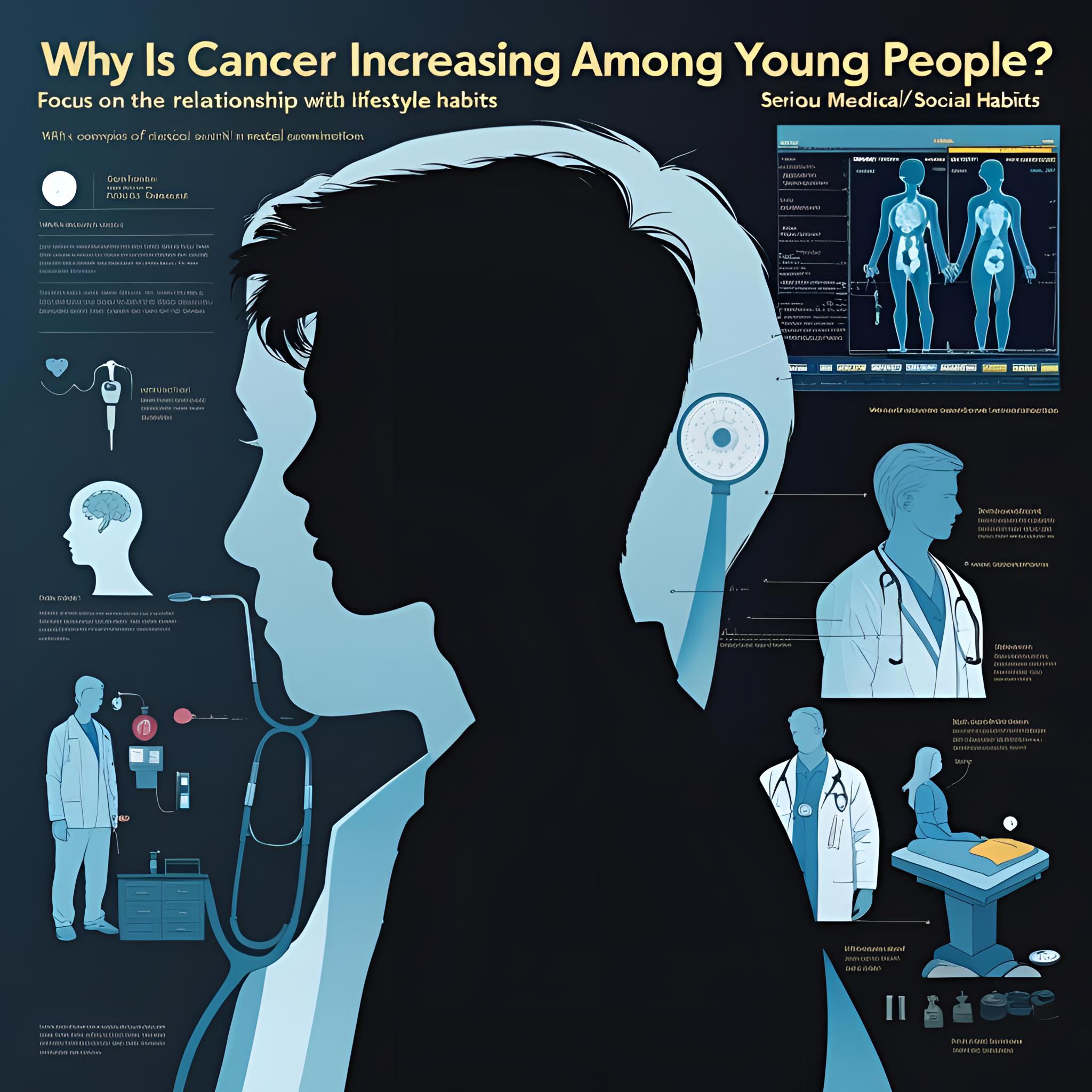 「若者にがんが増加する理由とは?生活習慣との関係に注目」 (1792×1024/シリアスな医療・社会問題系ビジュアル)若者のシルエット × 暗めの背景 × 医療や検診を連想させる要素 この構成で、社会問題としての重みと、「見過ごせない現実」感を伝えるようにするぞ。 _ 画像イメージの詳細 背景は少し暗めのブルーやグレーを基調とし、不安や現実味を演出 若者(男女問わず)の横顔や後ろ姿のシルエット 医療機器(聴診器、CTス X Facebook はてブ LINE Pinterest コピー 2025.06.08
