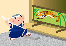 一休:「承知しました。では、私が縄を持って待ち構えますので、将軍様、虎を屏風から追い出してください!」