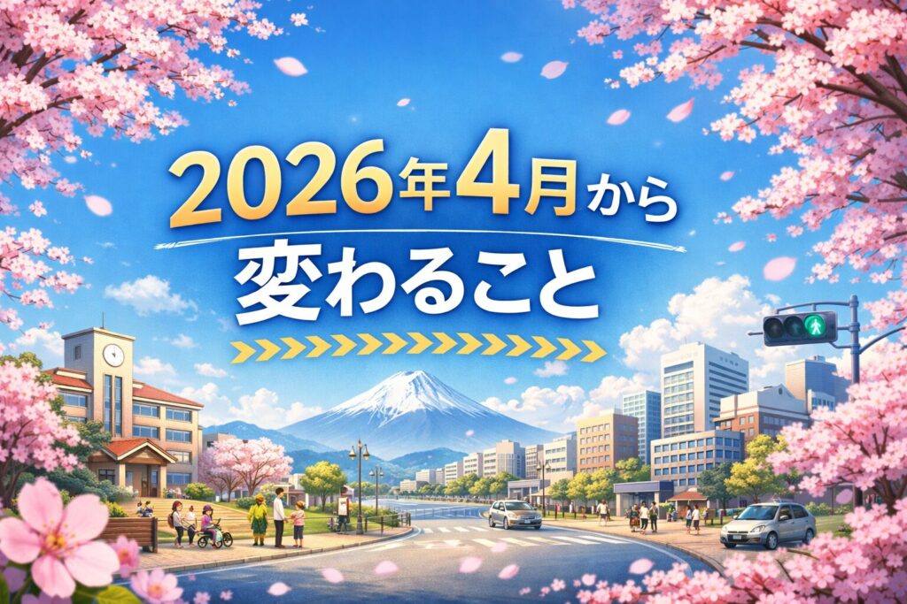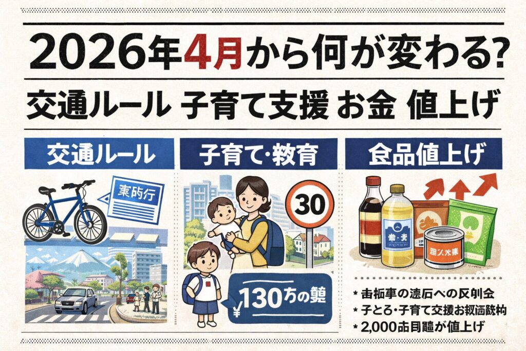 2026年4月は、交通ルール強化(青切符)、子育て支援拡大(誰でも通園・高校無償化・給食支援)、一方で支援金徴収と食品値上げ…。負担と支援が両方来る年やね。