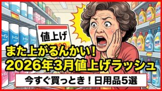 未分類 2026年3月値上げ|日用品5選は今すぐ買っとき!失敗しない節約術 「また上がるんかい!」2026年3月の値上げラッシュを賢く乗り切る!今すぐストックすべき日用品5選「なんなん、もう!また上がるんかいな!」スーパーのチラシを見て、思わず独り言が出ちゃったあんた。安心して、ウチもや。2026年になっても、値上... 2026.02.17 未分類
